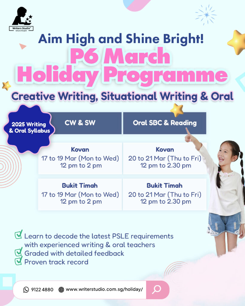 The March holidays are the perfect time to discover writing and oral weaknesses early – while there is still time to do something about them. In line the new PSLE expectations, our P6 Intensive Holiday Programme will focus exclusively on Creative Writing and Oral, equipping students with essential techniques to excel in these key components.