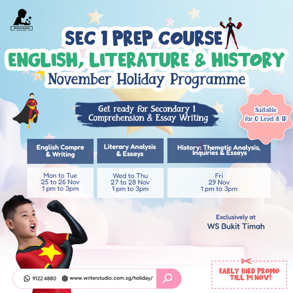 Prepare your PSLE student for a smoother transition into Secondary 1 with a compact course covering the essentials of English Reading Comprehension and Writing, Literature Essays, and History Essay Writing. This programme is ideal for students preparing for O Level and IP classes in 2025, equipping them with the basic skills needed to handle these subjects. This is also a taster programme, giving you a preview of our new extensive courses for Humanities.